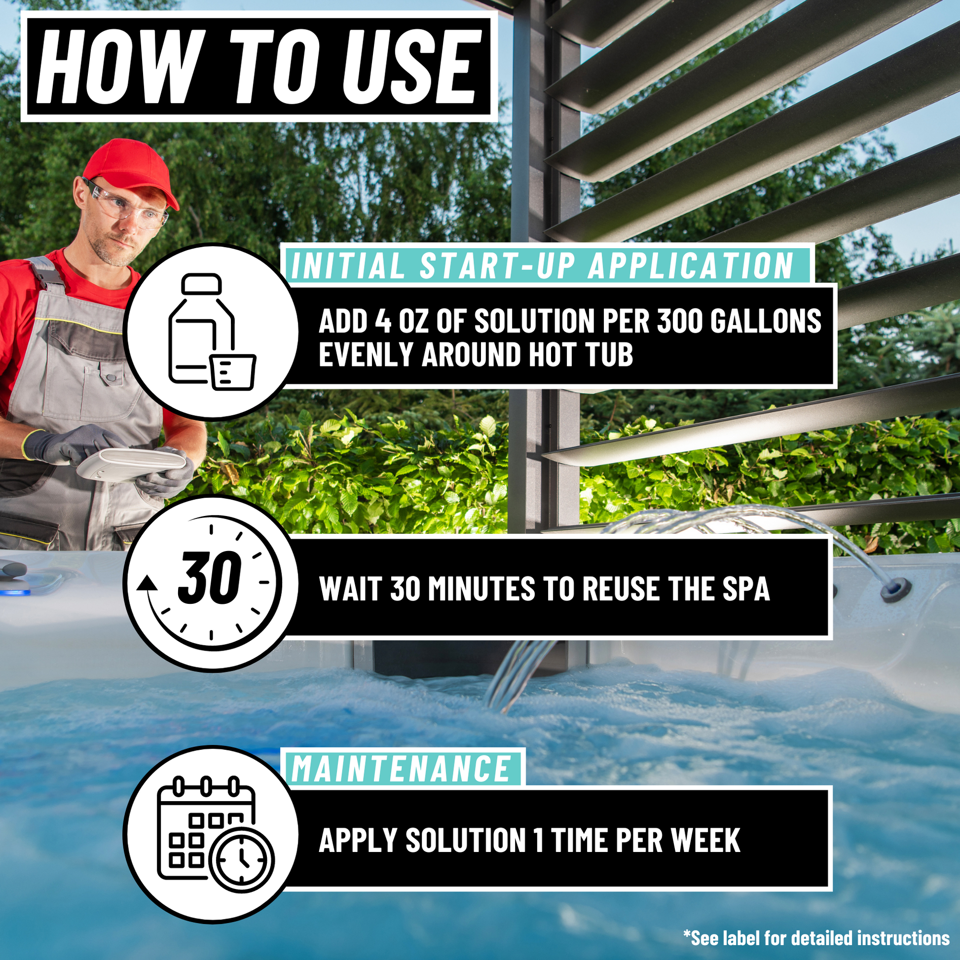 EASY TO USE: Simply add the recommended dose to your Hot Tub following the included guidelines to ensure optimal cleanliness and water clarity. 4 Oz per week for a standard, 400 gallon hot tub/spa. Amazing metal and stain control for hot tubs. Keep your spa metal free for hot tub time!