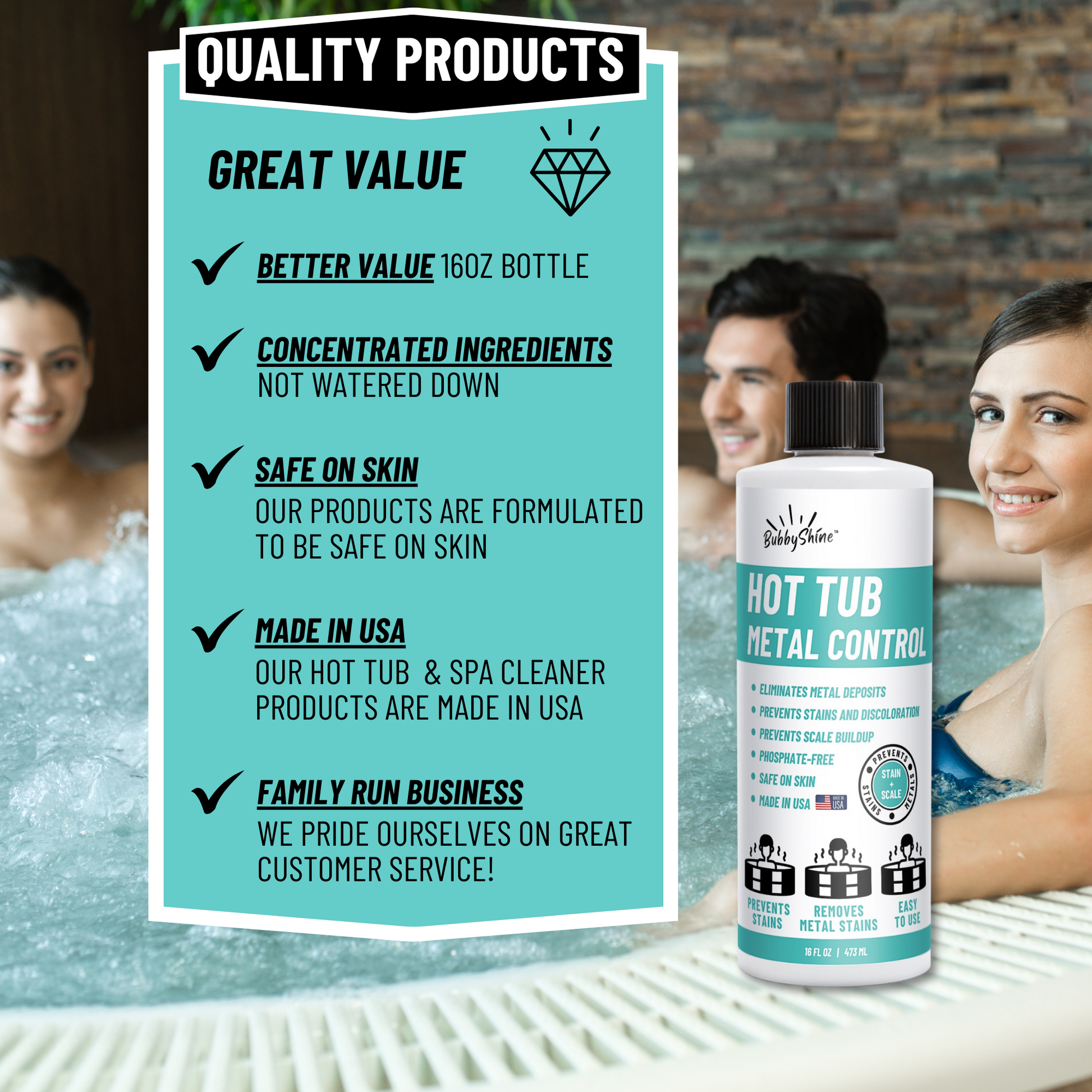HOT TUB METAL CONTROL: Prevent metal buildup in your hot tub. Eliminate metal before it starts and avoid staining in your spa or hot tub. Control metal accumulation by stopping iron and other metals from oxidizing and preventing metallic stains in your spa.
